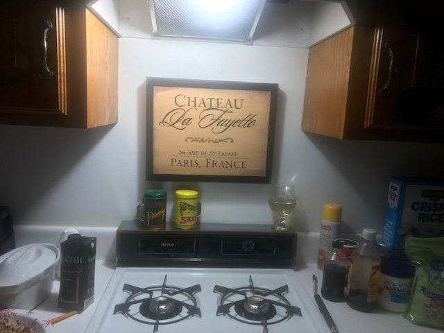 Wooden shelf from friend, Patty Black, clock already in villa (Dave repaired), round plate from Italy, walking stick from Northern Ireland, art work by Mark Bercier (New Orleans, LA), Vergie Banks (Lafayette, LA), Cooper Harris (Lafayette, LA) and Dennis Paul Williams (St. Martinville, LA)