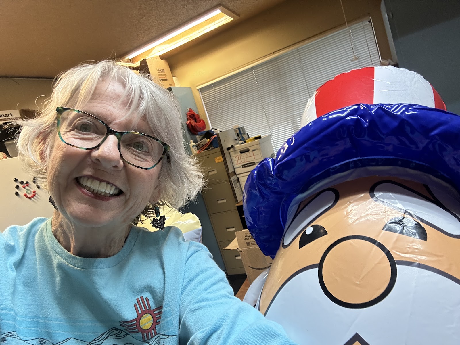 Vannie is standing by 2 paintings that had been stolen from the Harwood